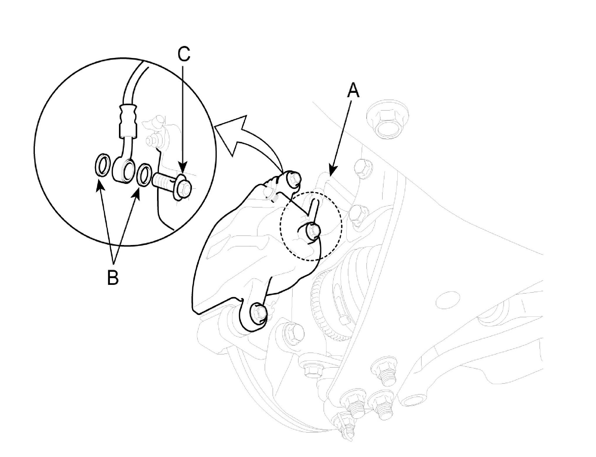 1. Install a brake hose (A) on the caliper with tightening brake hose bolt (C) and washer (B).
