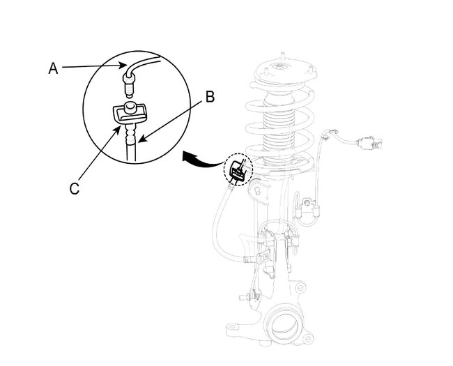 2. Install the brake hose clip (C) to the brake hose bracket (B), then install the brake hose (A).