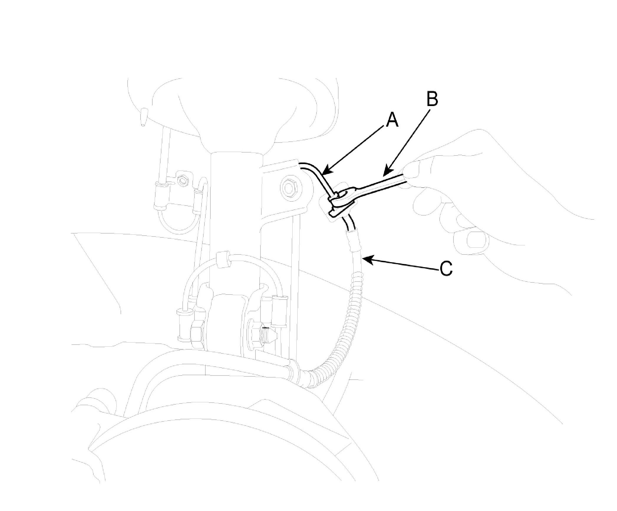 1. Disconnect the brake hose (C) from the brake line (A) using a flare-nut wrench (B).