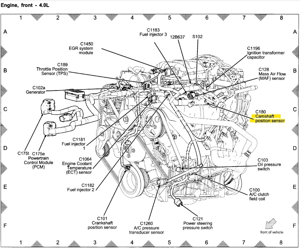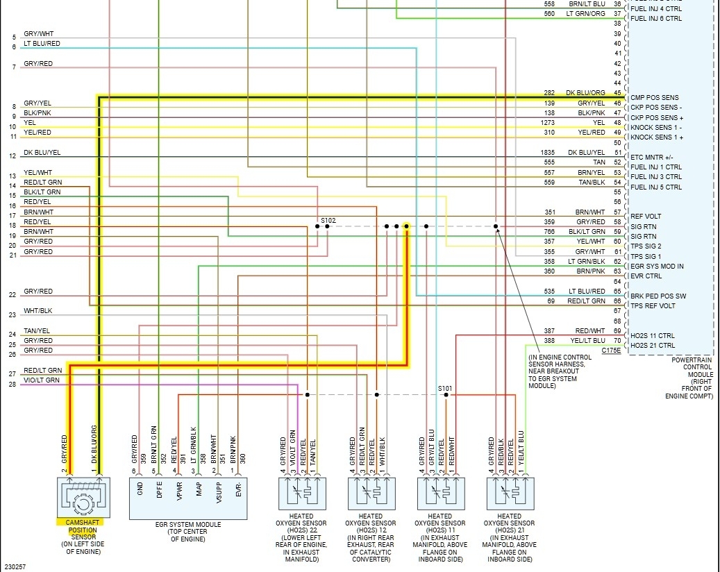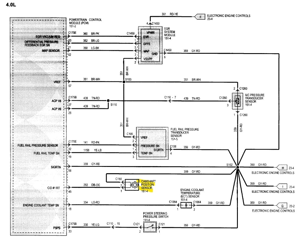 Here is the wiring diagram for the camshaft position sensor and its location. I'm not sure why they did not include a cam sensor for both banks, and if this is the same engine as I have, the timing chain setup can be a really difficult repair, because the timing chain for the passenger side is at the rear of the engine on that side and the timing chain for the driver side cylinder head is at the front of the engine, and the engine actually needs to be removed to replace the chains, it's not a good design at all.