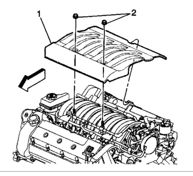 Remove the 2 nuts (2) from the intake manifold sight shield (1).