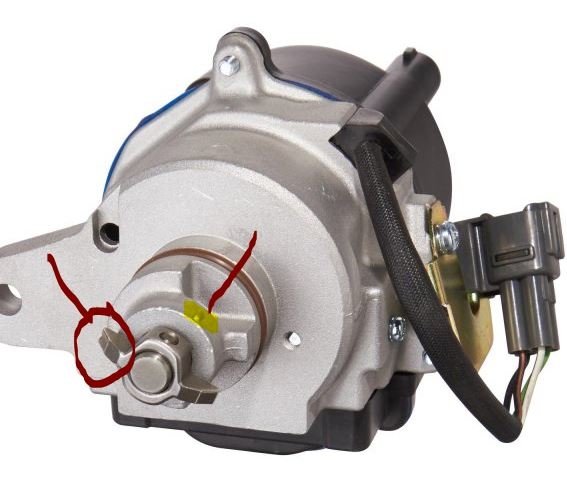 To install the replacement you need to set the engine at top dead center on the compression stroke. You do that by removing the spark plug from cylinder number one. Then you put a finger or dowel tightly over the spark plug hole and listen as you turn the engine by hand. As it nears TDC you should hear a hissing sound as the air tries to escape, now gently rotate the engine clockwise until the notch on the balancer lines up with the TDC pointer. Then verify that the slot in the camshaft matches the picture. Next you apply a bit of clean oil to the o-ring on the new part, then rotate the drive on the distributor so that the notch on the drive lug matches the small bar on the housing, those are the items that need to line up marked in the picture. At that point the new distributor should slip into place and you can install the bolt. Now you can use the old cap numbers as a guide and remove the wires from the old cap and place them onto the correct terminals on the new part.