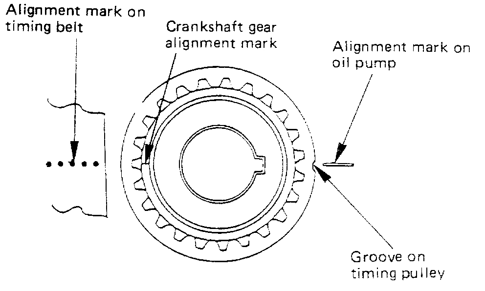 3) Install timing belt. Align the dotted alignment mark on the timing belt with the mark on the crankshaft gear.
