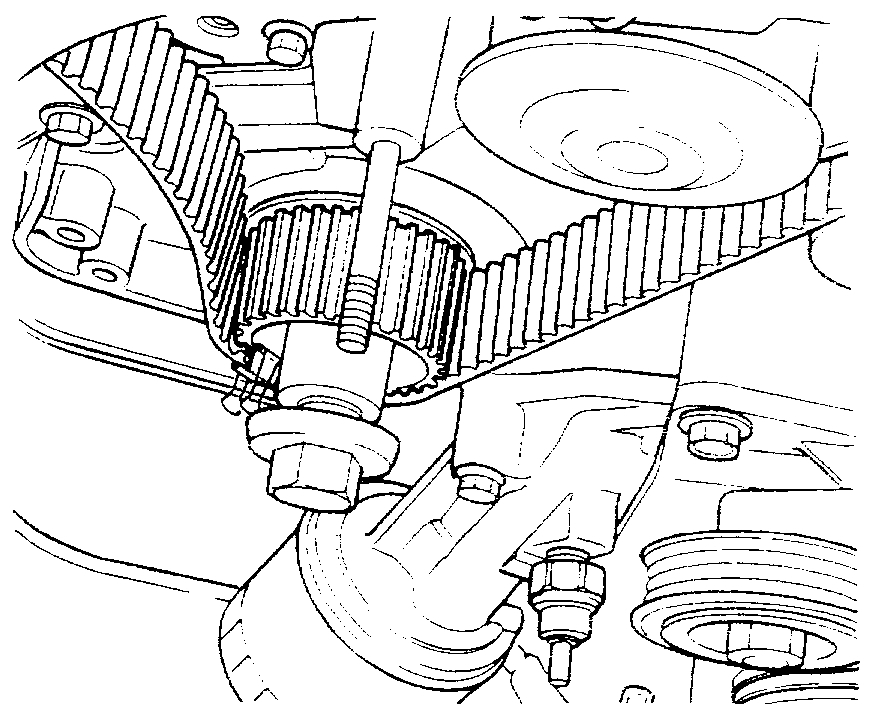 - Using special tool J-8614-01, hold the crankshaft pulley.