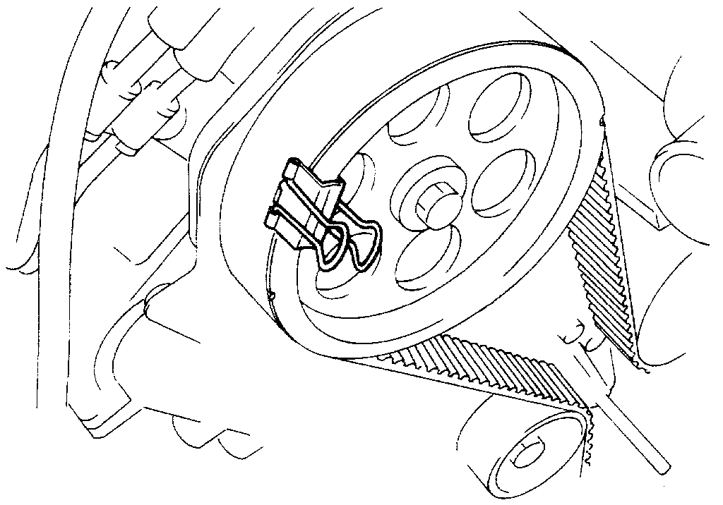 4) Align the alignment mark (white line) on the timing belt with the alignment mark on the RH bank camshaft timing pulley (on the left side as viewed from the front of the vehicle Secure the belt with a double clip.