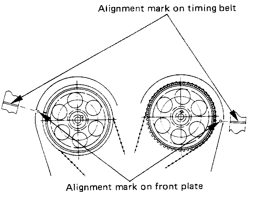 2) Align the marks on the camshaft timing pulleys with the corresponding dots on the front plate.