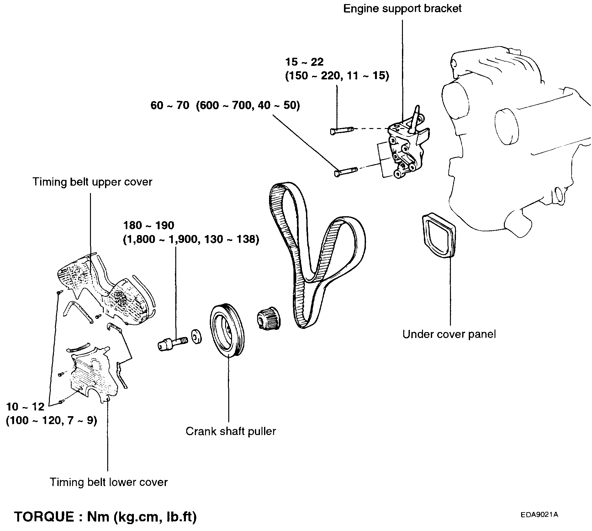 6. Align the timing marks of each sprocket and install the timing belt in the following order.
