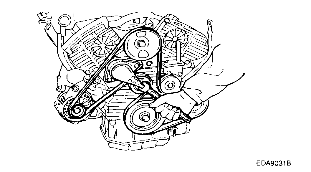 9. Install the power steering pump pulley, idler pulley, tensioner pulley and crankshaft pulley.