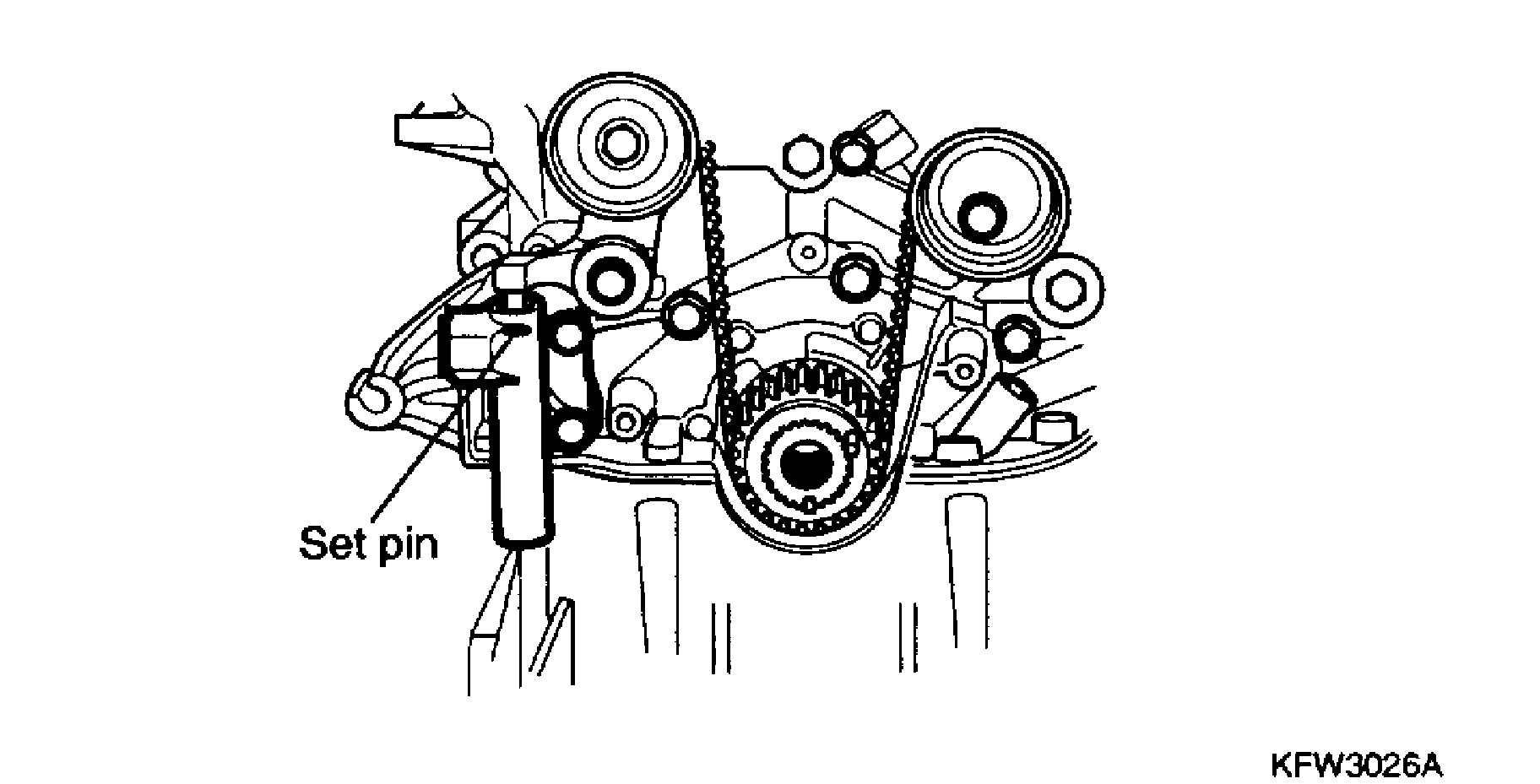 Note:At this time auto tensioner's set pin should be compressed and secured with set pin.