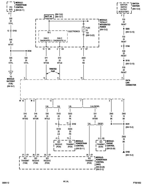 Either the Controller Area Network (CAN) data bus or the hybrid bus system that integrates the Programmable Communications Interface (PCI) data bus with the CAN bus allows all electronic modules or nodes connected to the bus to share information with each other. Regardless of whether a message originates from a module on the low speed PCI or CAN-B bus or on the high speed CAN-C or CAN-D bus, the message structure and layout is similar, which allows the Totally Integrated Power Module/Central GateWay (TIPM or TIPMCGW) to process and transfer messages between the buses. The TIPM also stores a Diagnostic Trouble Code (DTC) for certain bus network faults.