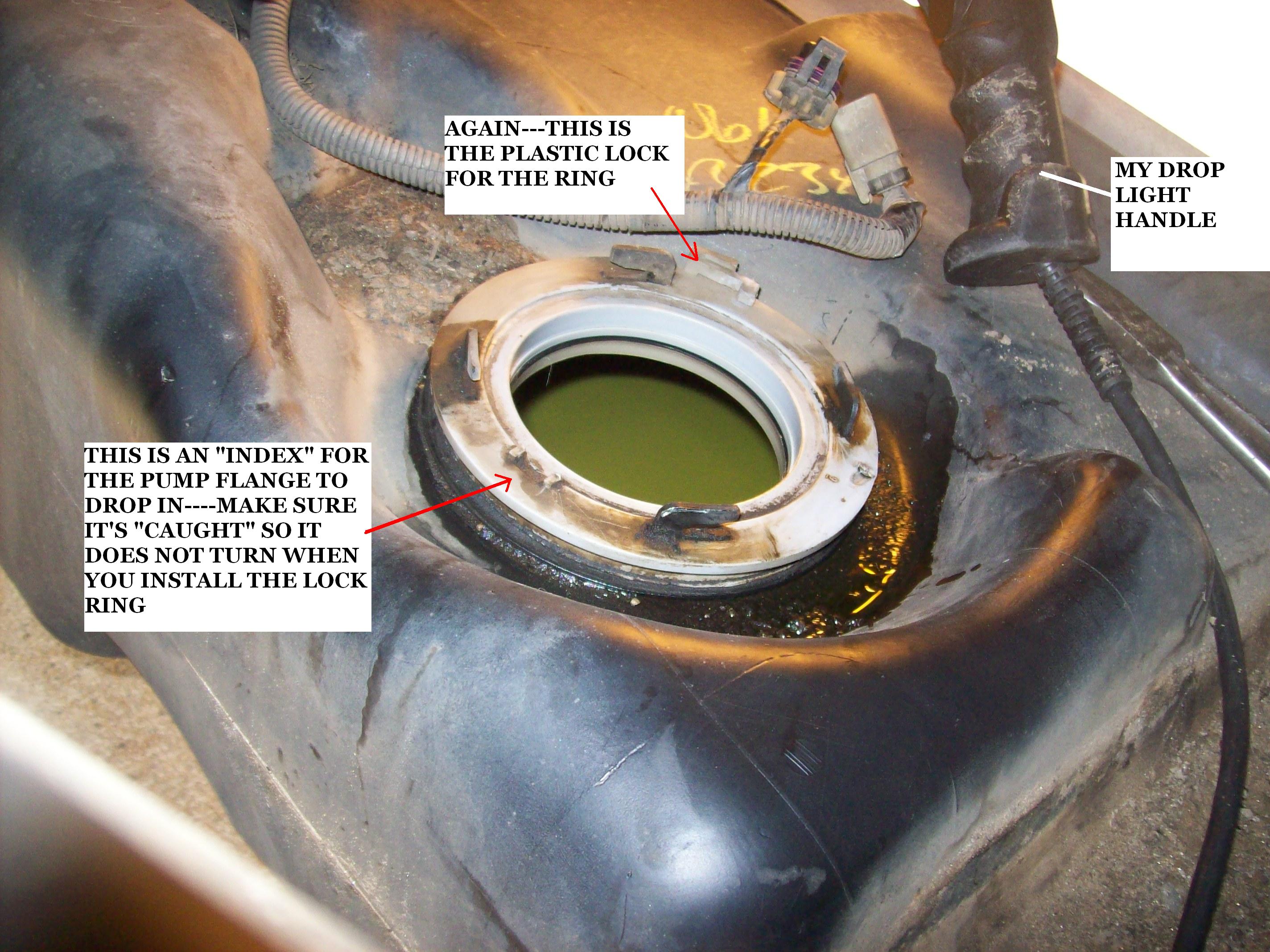 1.Install the sending unit and a NEW rubber seal. Align the alignment tab to the correct location on the fuel tank.