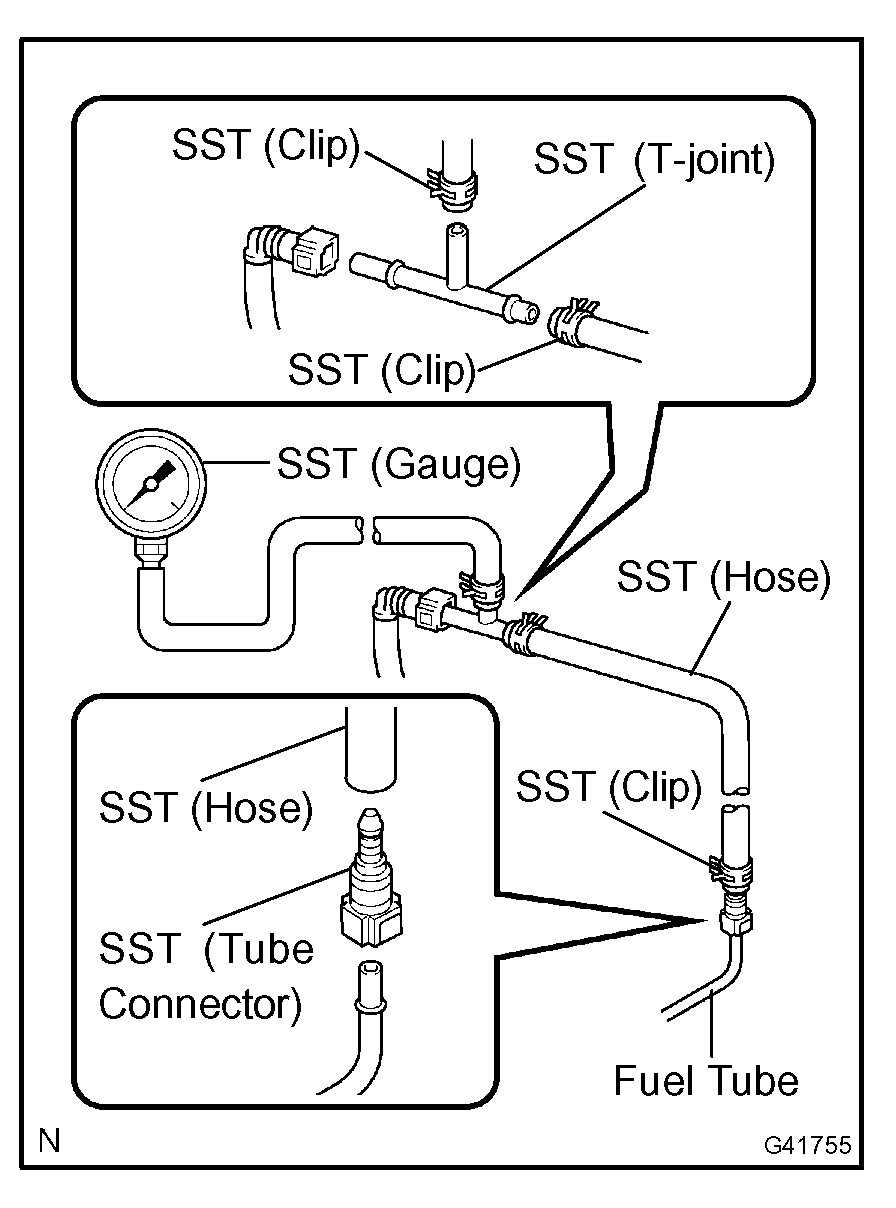 e. Install SST (pressure gauge) using SST and a fuel tube connector as shown in the illustration.