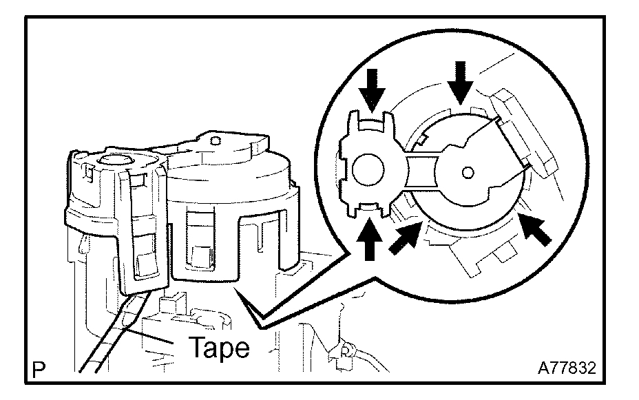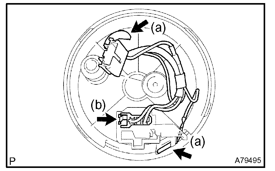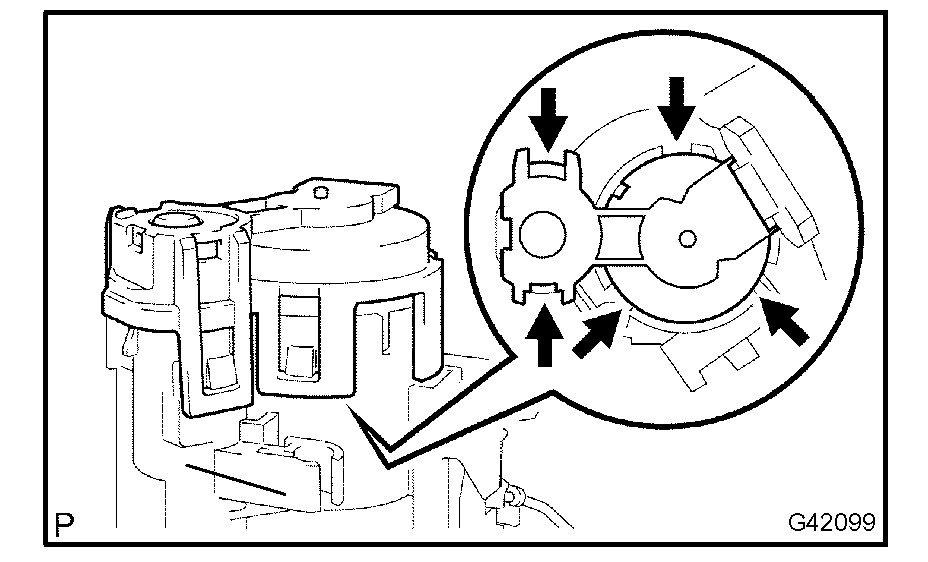 b. Using a screwdriver with its tip wrapped with tape, disengage the 4 snap claws from the claw holes, and pull out the fuel suction plate.