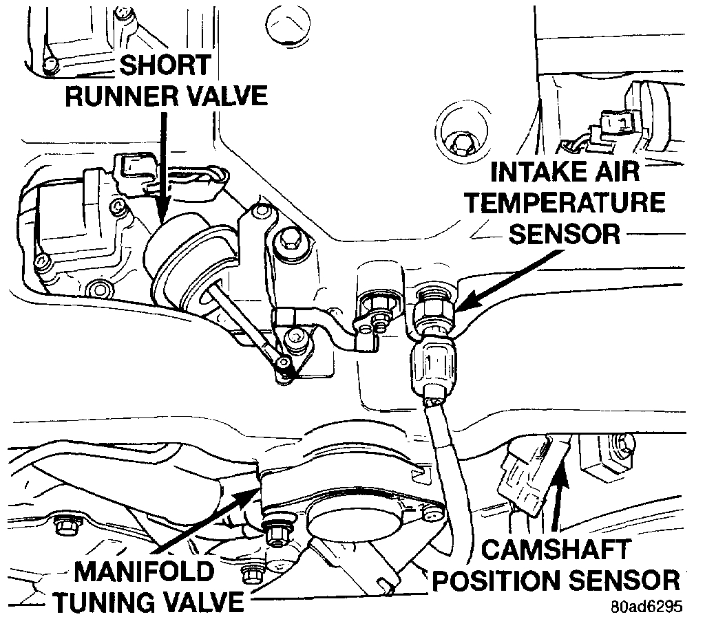 The camshaft position sensor is installed in the timing belt housing cover above the left camshaft sprocket.