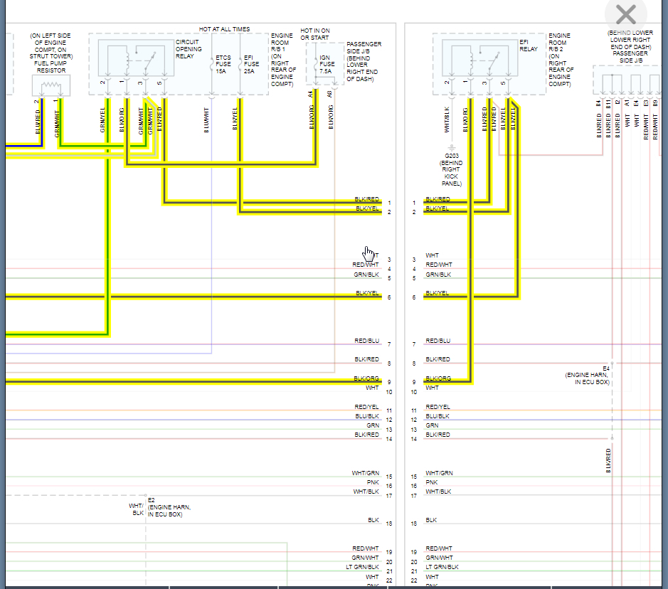 The EFI relay get its voltage sent to it from the ECM to close the relay on the black/orange wire. Once it is closed it sends this voltage on the Black/red wire to the opening circuit relay. The EFI relay gets the power from the EFI fuse so we need to check that as well.