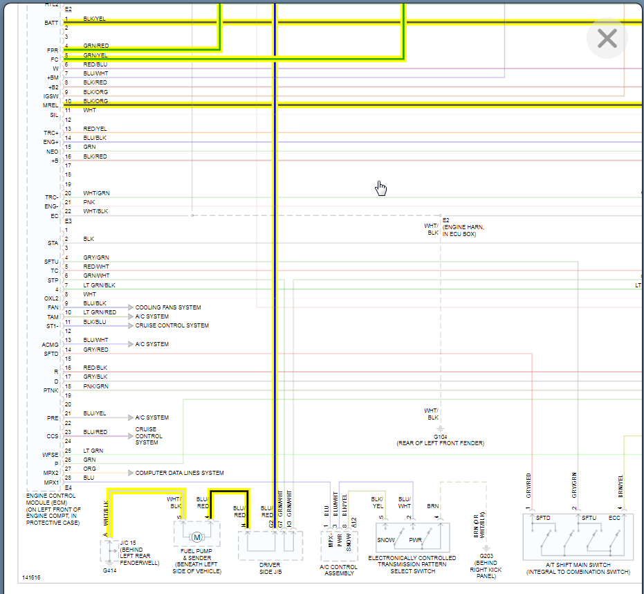 So the pump is feed from the Blue/red wire on the fuel pump relay. When the ECM wants this relay on, it grounds the green/red wire and it closes the relay to send power to the pump.