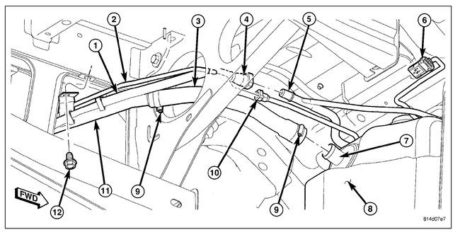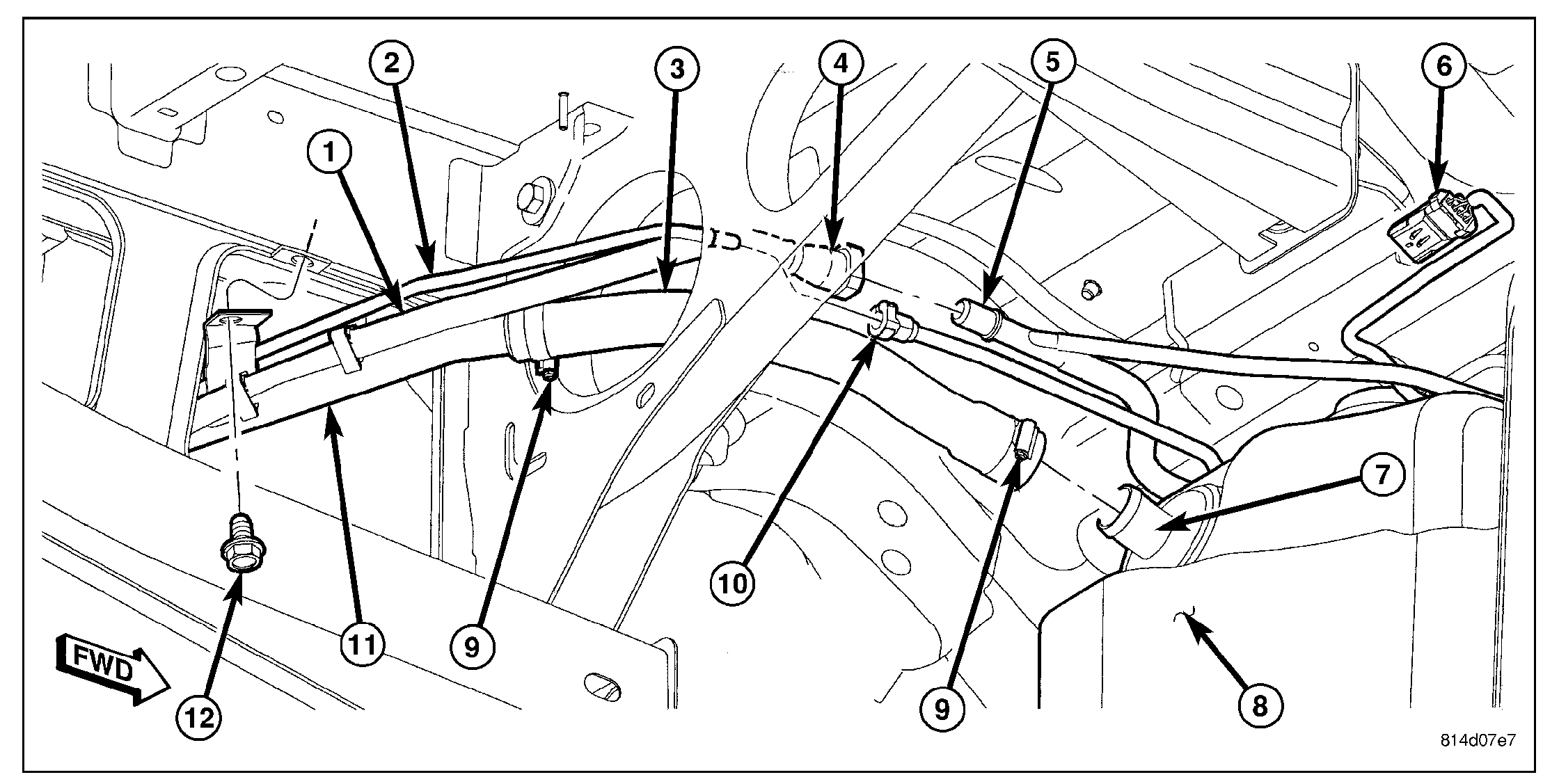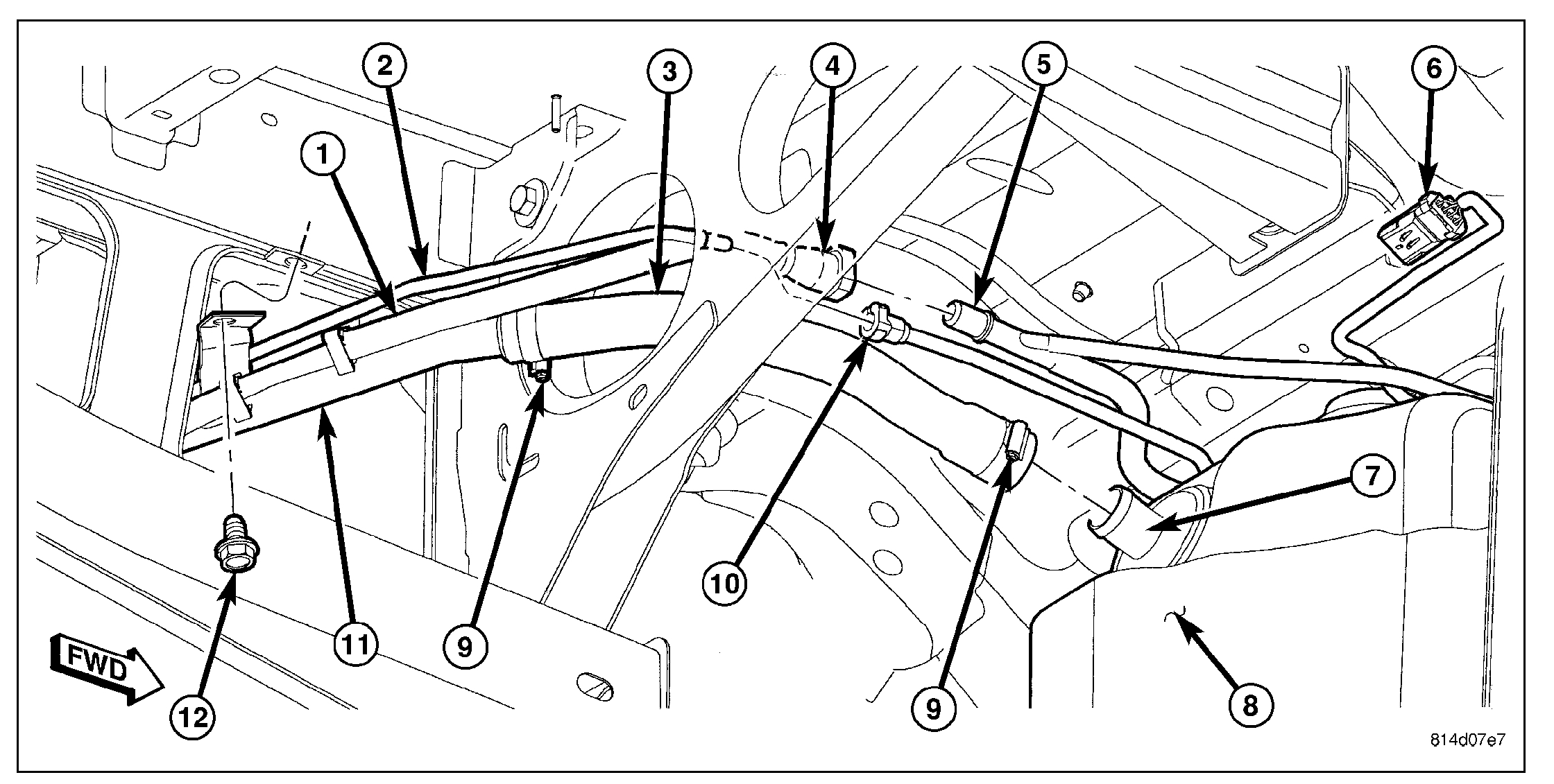 4. At front of tank, disconnect fuel and EVAP lines (9) and (10) from lines (11) and (12).