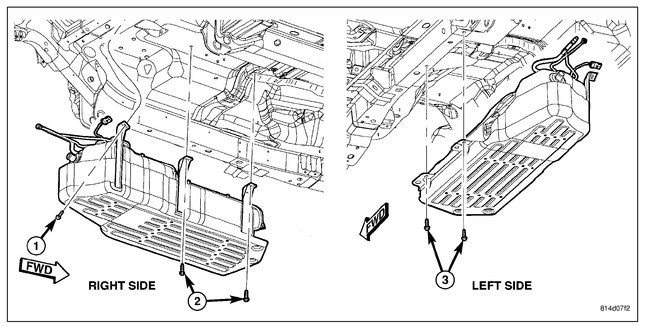 6. Remove bolts (1) and (2) at right side of fuel tank.