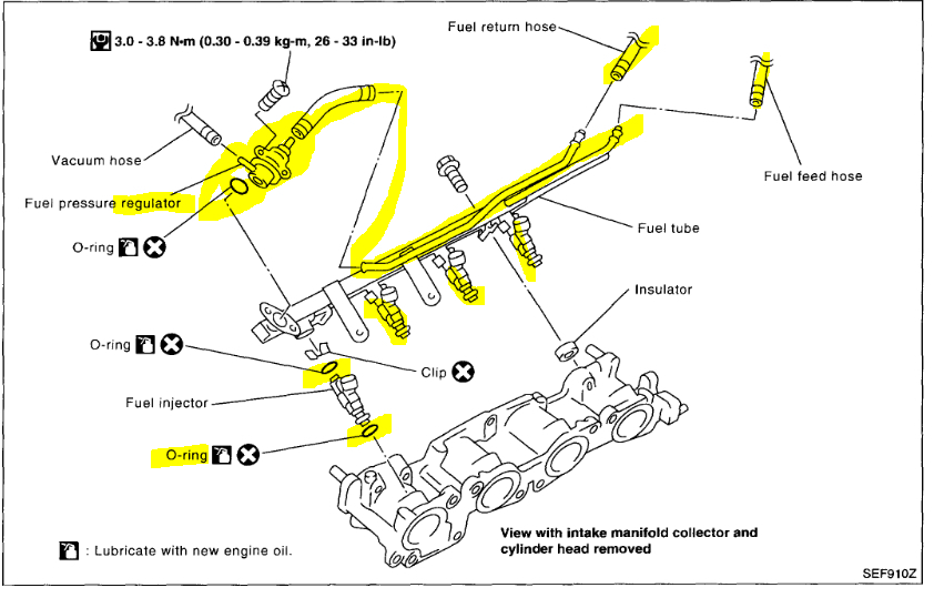 As I mentioned, the Sunny isn't listed in any of my manuals. However, I attached a pic below of a Sentra and highlighted areas I would recommend checking. Note that each fuel injector will have two o-rings, so check closely around those areas.