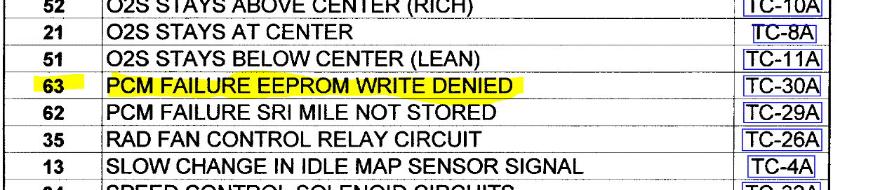 Code 3 shouldn't exist but when I look it up, it indicates a ram (random access memory) failure. That leads me to the 63, that indicated a PCM failure. The two tie together.
