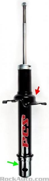Here is two photos that show the front strut for your car. The green arrows are pointing to the lower end that slides into a pocket on the spindle, then it is clamped there. The red arrows are pointing to the steel plate that's welded to the strut body. This is where the coil spring sits, and where it pushes down to hold the car up.