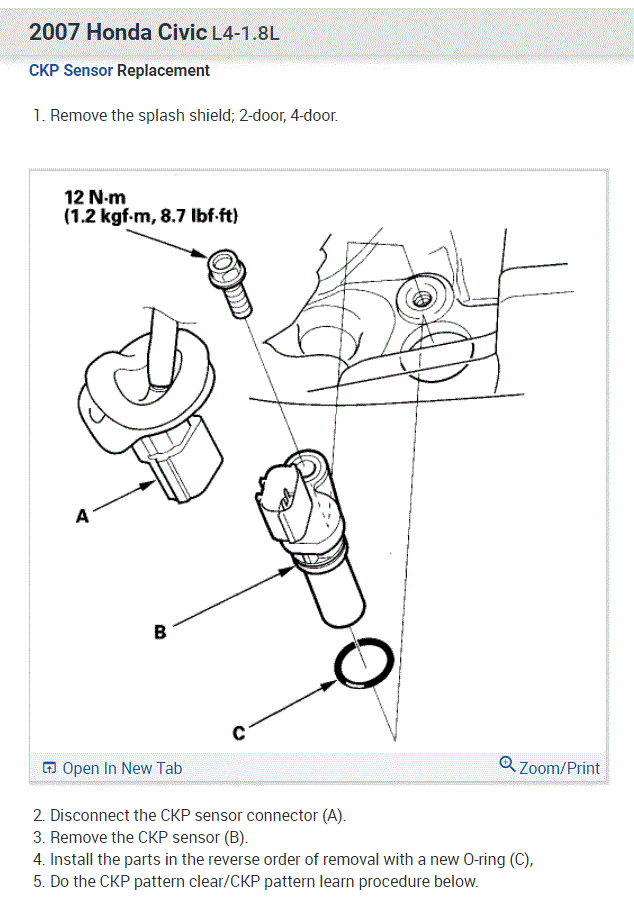 The pictures below include the directions specific to your vehicle for replacement and the relearn procedure. Note, the relearn can be done without a scan tool. I included that procedure as well. If you look at the last pic, it shows the sensor (CKP) location.