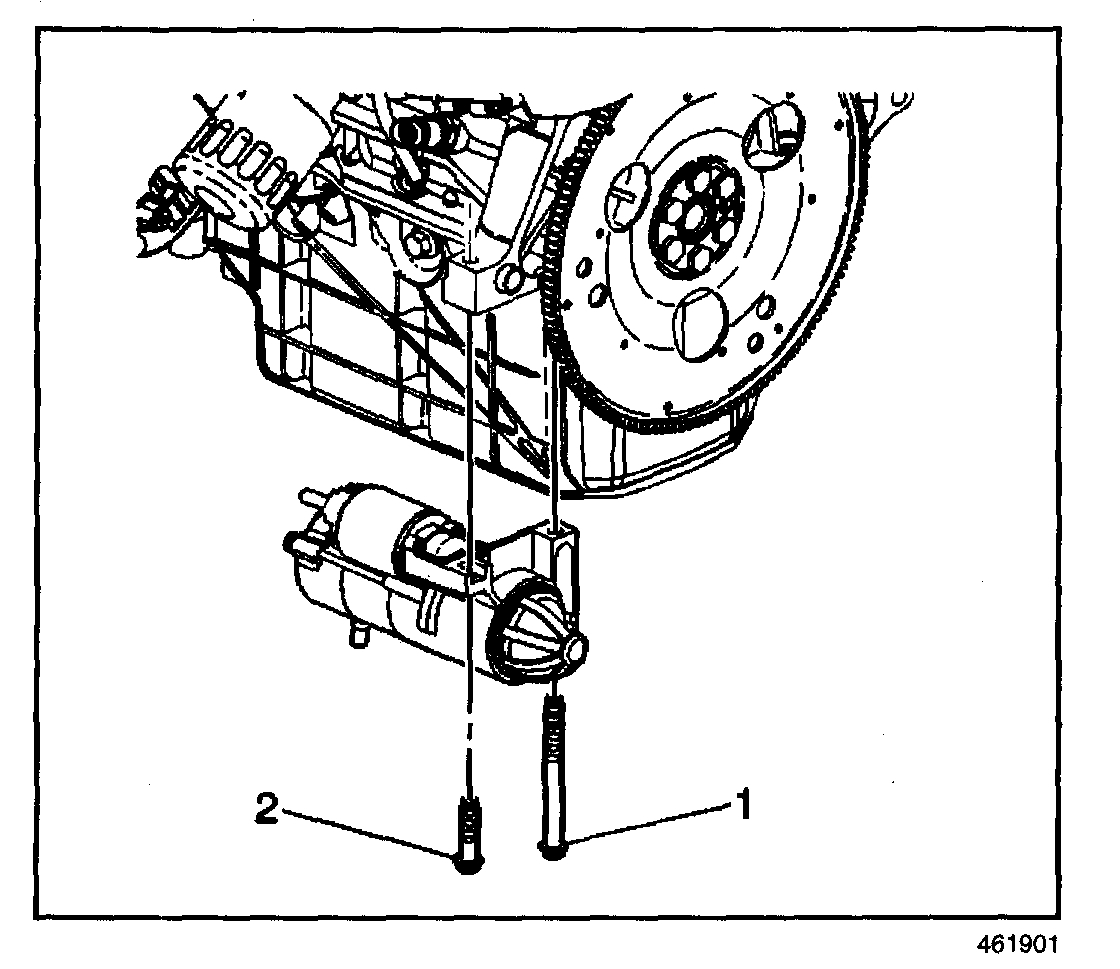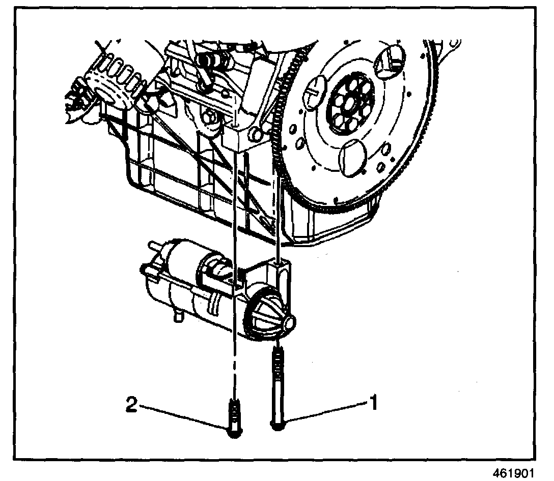 7. Remove the starter bolts (1,2) and the starter motor.