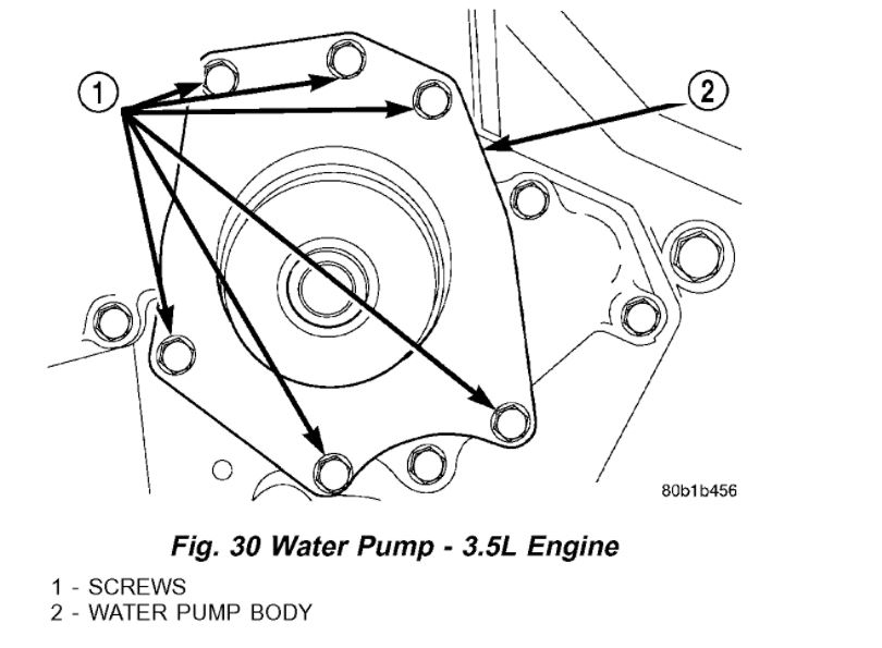 NOTE: It is normal for the water pump to weep a small amount of coolant from the weep hole (black stain on water pump body). Do not replace the water pump if this condition exists. Replace the water pump if a heavy deposit or a steady flow of engine coolant is evident on water pump body. This indicates a shaft seal failure and pump must be replaced. Be sure to perform a thorough analysis before replacing water pump.
