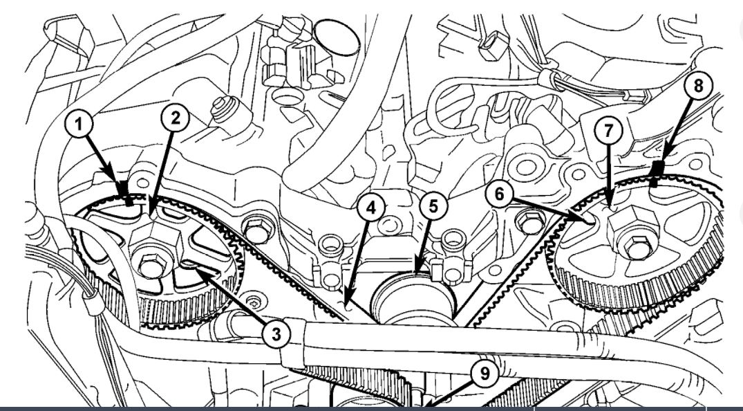 2) Align the camshaft sprockets (2, 7) timing reference marks (1, 8) with the marks on the rear cover.