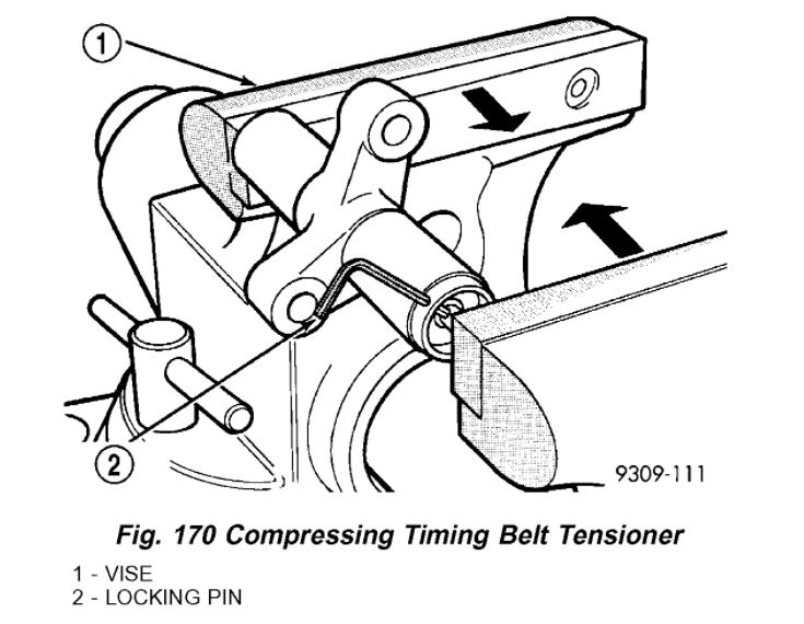 a) Place the tensioner into a vise and SLOWLY compress the plunger (Fig. 170). Total bleed down of tensioner should take about 5 minutes.
