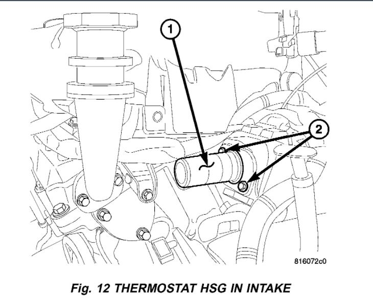 4) Remove thermostat housing bolts (2) (Fig. 12).