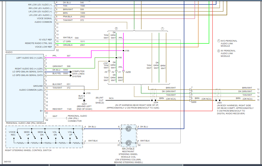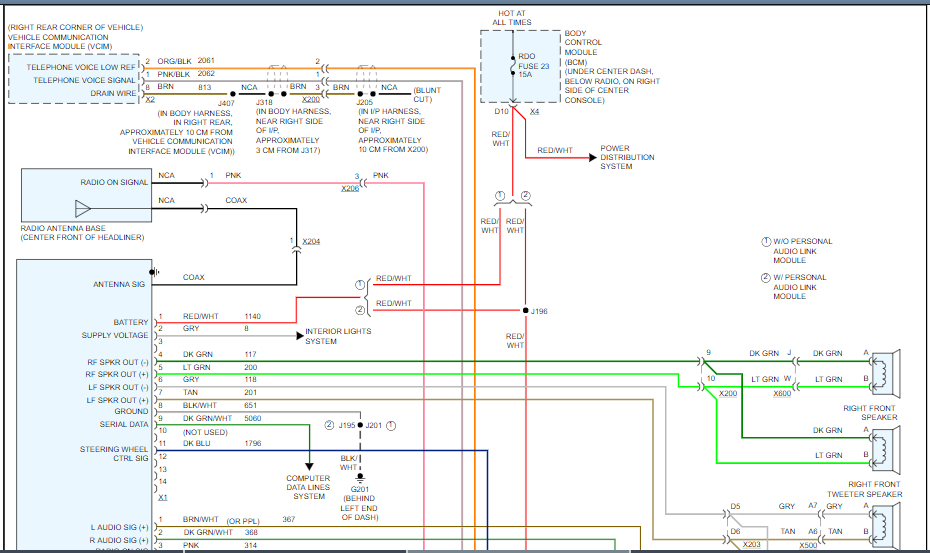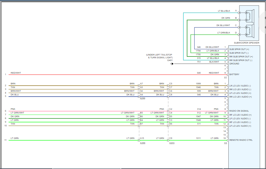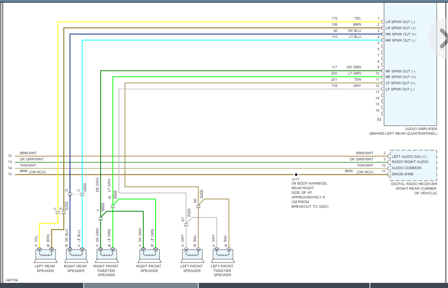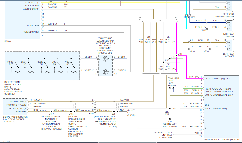 I've attached wiring diagrams below for the 2 different audio systems available in your vehicle. I've cut the pictures in half so you can view larger. The first pictures are for audio system equipped with an amplifier and the second set is for without. Hope this helps and thanks for using 2CarPros.