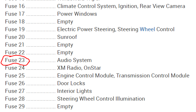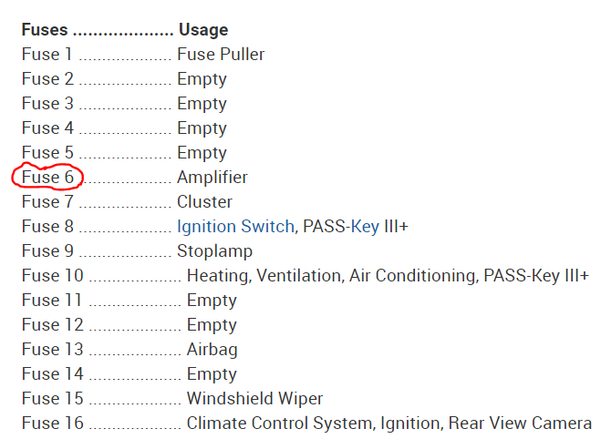 I've attached pictures below of the right side center console fuse block relating to the 2 fuses related to the amplifier and audio system. The amplifier fuse is in location #6 and the audio system fuse is in location #23. Hope this helps and thanks again for using 2CarPros.