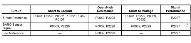 The barometric pressure (BARO) sensor measures the pressure of the atmosphere. This pressure is affected by altitude and weather conditions. A diaphragm within the BARO sensor is displaced by the pressure changes that occur from varying altitudes and weather conditions. The sensor translates this action into electrical resistance. The BARO sensor wiring includes 3 circuits. The BARO sensor and all related circuits are inside the engine control module (ECM). The BARO sensor provides a signal voltage to the ECM, relative to the pressure changes on the BARO sensor signal circuit. The ECM converts the signal voltage input to a pressure value. Changes in BARO due to weather are relatively small, while changes due to altitude are significant. Pressure can range from 56 kPa at an altitude of 4,267 meters (14,000 feet), to 105 kPa at or below sea level. The BARO sensor has a range of 0-128 kPa. The ECM uses the BARO sensor input for fuel delivery and other diagnostics.