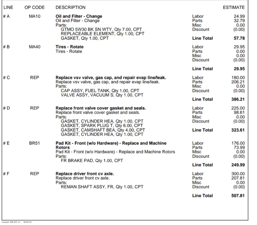 The list consists of typical maintenance and ware and tare items. Like the brakes, oil change, CV axle, and valve cover gasket (likely due to oil leak).