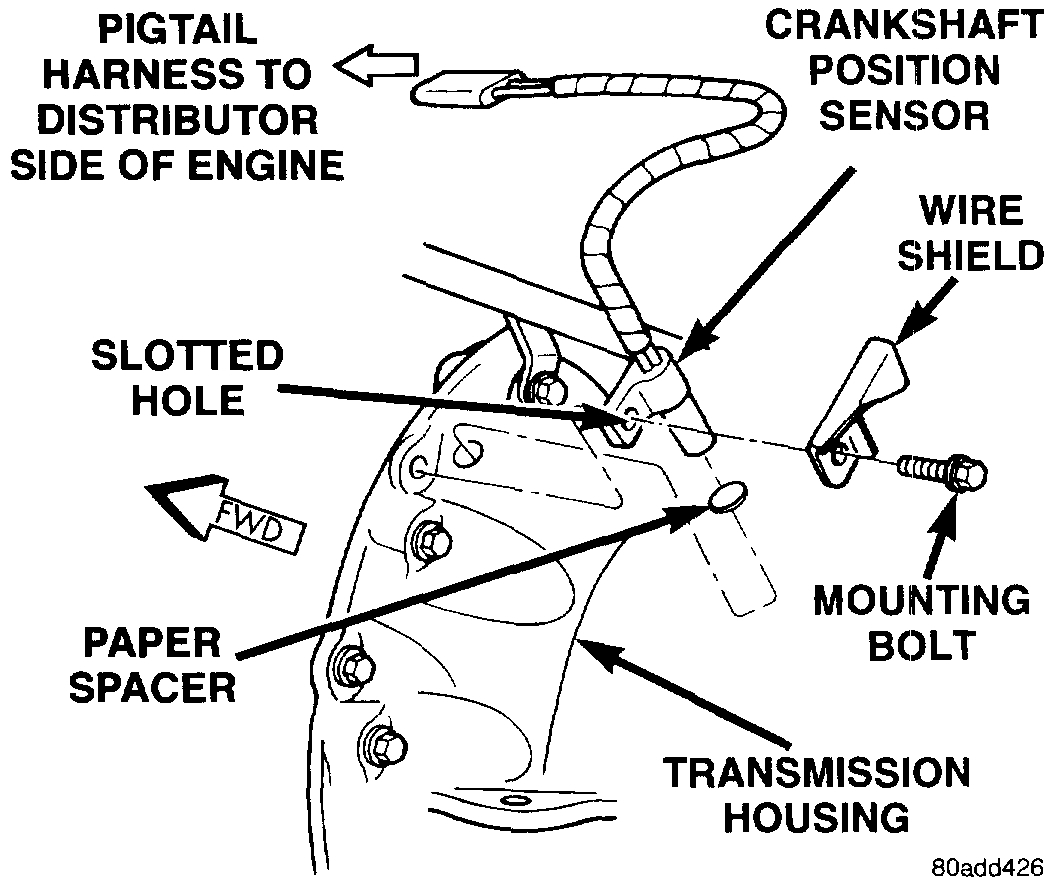 The crankshaft position sensor is mounted to the transmission bell housing at the left/rear side of the engine block. The sensor is adjustable and is attached with one bolt. A wire shield/router is attached to the sensor.