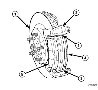 1. Place the brake pads (4, 5) in the abutment shims (3) clipped into the disc brake caliper adapter bracket (2) as shown. Place the pad with the wear indicator (if equipped) attached on the inboard side (2).