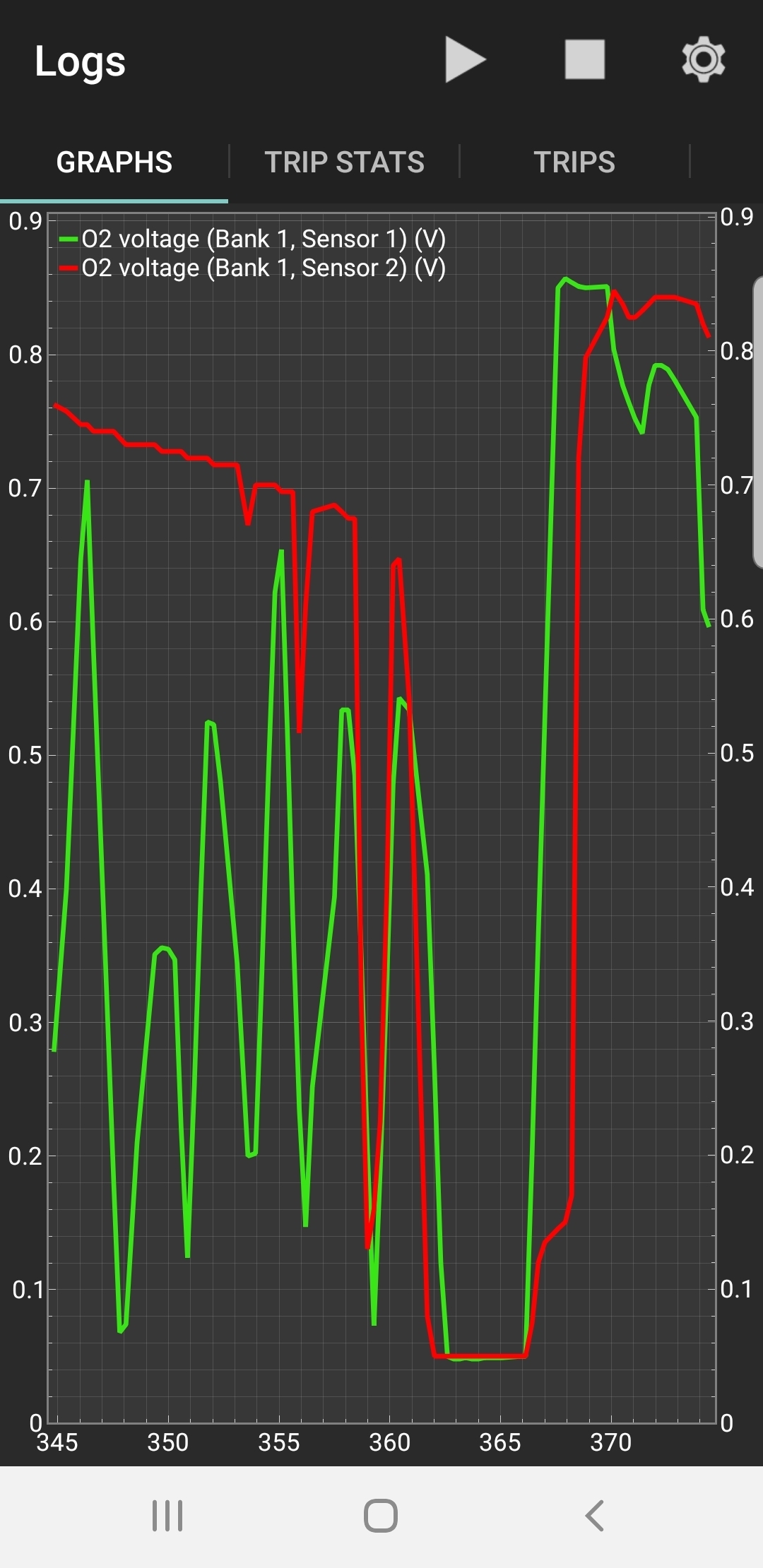 My car, during reverse it stumbles, and when taking off from a stop it's jerky. So to compensate for the problem to not happen, I have to hit pedal hard, the car never shut off on me, no check engine light, new ACdelco fuel pump, new spark plugs, and coil pack, new exhaust manifold gasket, new valve cover gasket. By the way this car model does not have a fuel filter, it's built in the pump. New throttle body, why because TPS sensor is connected to it, 2 new fuel injectors, I have a obd to look at my injectors it looks right, new down stream o2 however I think this may be the problem.I'm not that advance to no how to read trims to spot something. Forgot to mention static fuel rail pressure was checked and it's holding no more then 3 psi loss in a minute. The picture of both o2 sensor while driving 45 mph. Also I have the ability to do a video of the reading live.