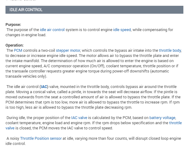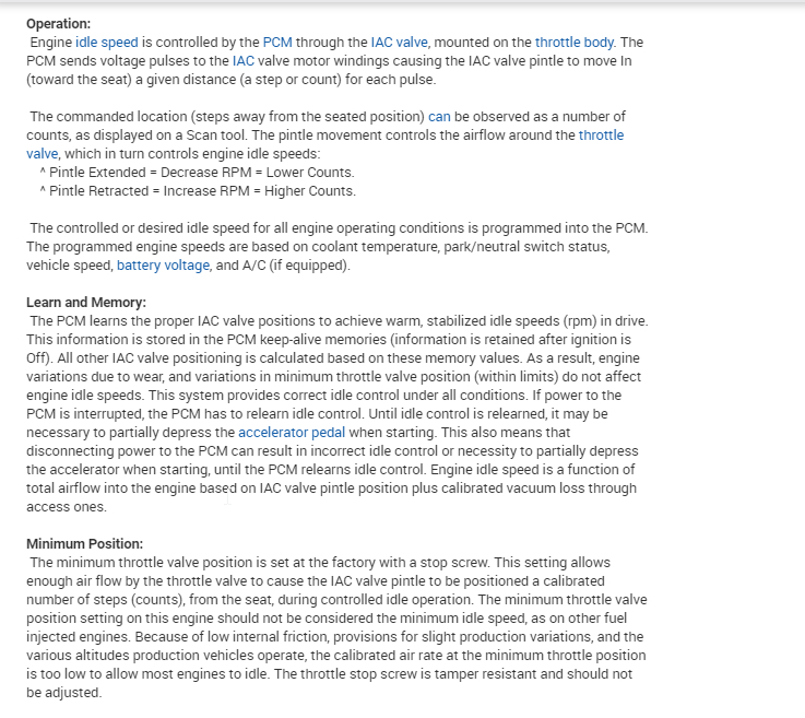 I have not had much success over the years with resetting the system but let's try it here. There is a reset procedure for the IAC and it can be done one of three ways. Two of them require a scan tool and most don't have one. The other is a battery disconnect. So take both terminals off the battery and touch them together. This is called a complete battery discharge. Then leave the battery unhooked for about 10 minutes.