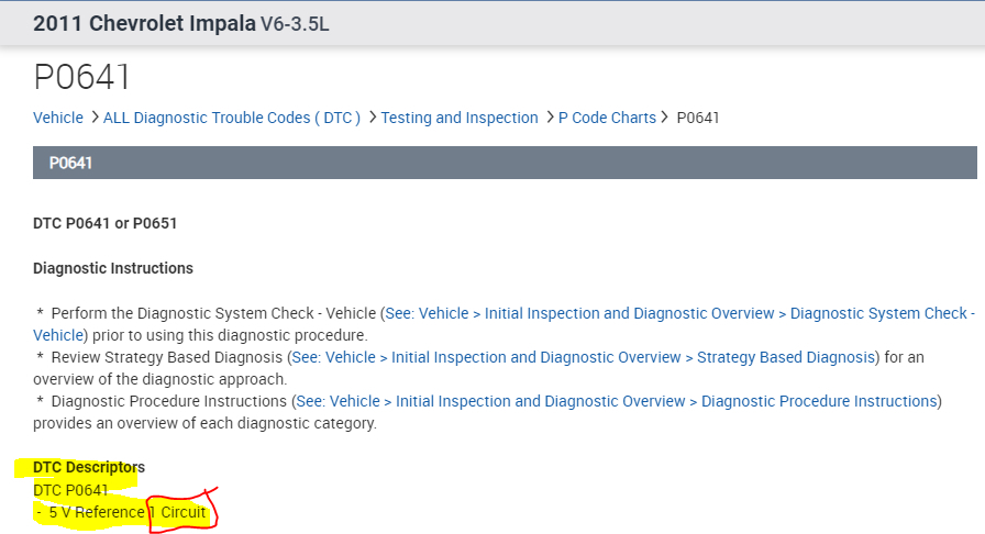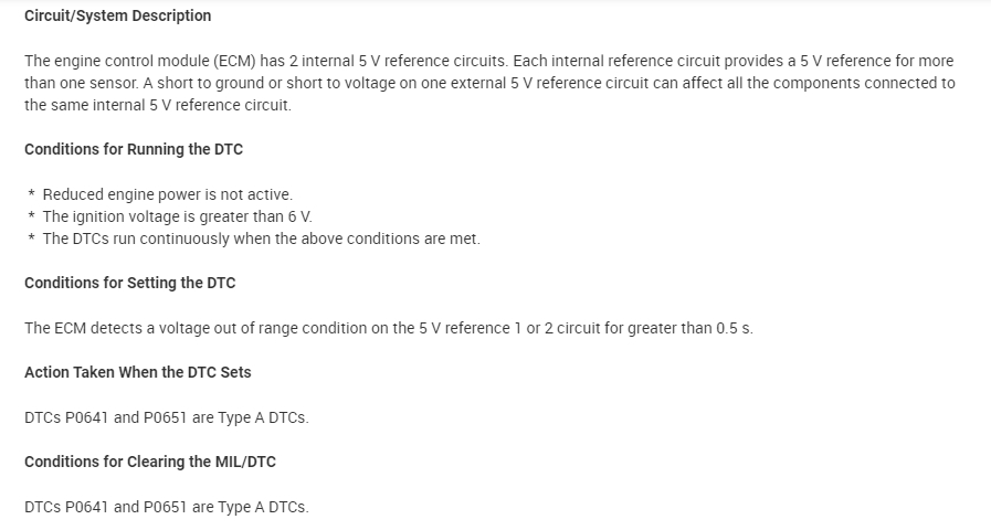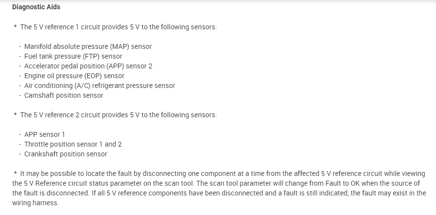 The engine control module (ECM) has 2 internal 5 V reference circuits. Each internal reference circuit provides a 5 V reference for more than one sensor. The code indicates there is a short to either ground or voltage on one of the 5 V reference circuits.