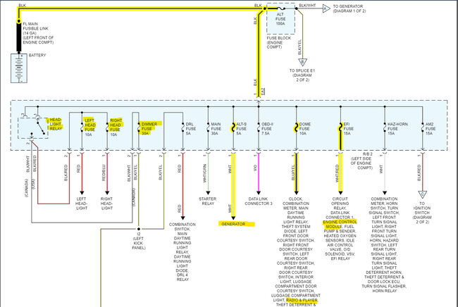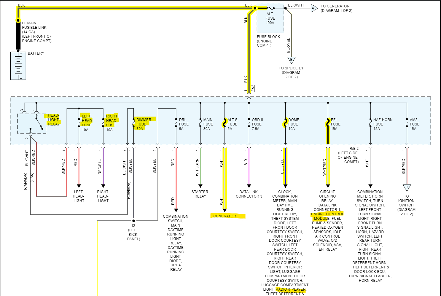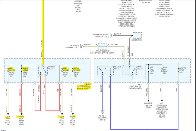 The diagrams 4,5 are the power feeds for the head lamps. I would try pulling out the Dimmer Relay, and some of the fuses for the head lights, see if any of these things changes the fault. or effects it at all. This might give us some direction as to what is happening.