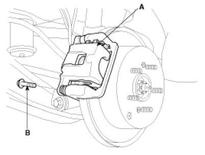 2. Remove the guide rod bolt(B), After raising the caliper assembly(A), support it with a wire.
