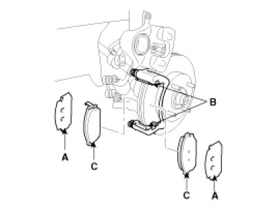 3. Remove pad shim(A), pad retainer(B) and pad assembly(C) in the caliper bracket.