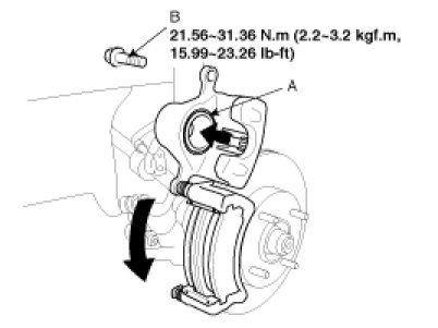 6. Pivot caliper down into position. Being careful not to damage the pin boot, install the guide rod bolt (B) and torque it to proper specification
