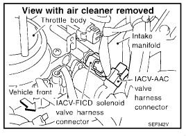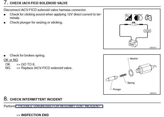 Next is the idle up solenoid. When the air conditioner is on, the IACV-FICD solenoid valve supplies additional air to adjust to the increased load. This could be an issue for your vehicle. I attached a picture if its location. Additionally, there is a flow chart for checking the idle up solenoid.