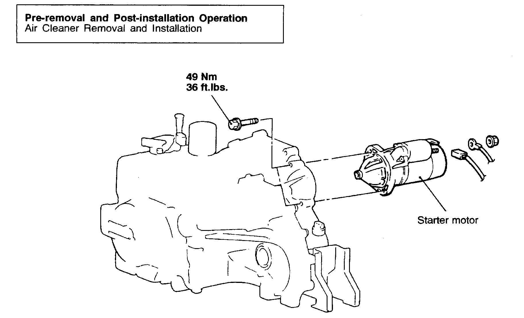I attached a picture specific to your vehicle for starter replacement. Make sure the battery is disconnected before starting to work on the starter. Then, remove the air filter box to access it.