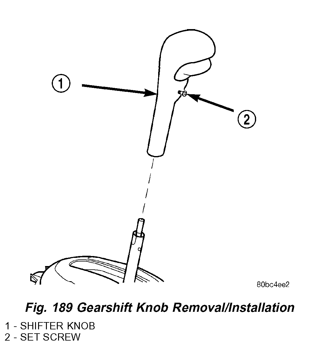 6. Install gearshift knob and tighten set screw to 2 Nm (15 inch lbs.) Torque (Fig. 189).