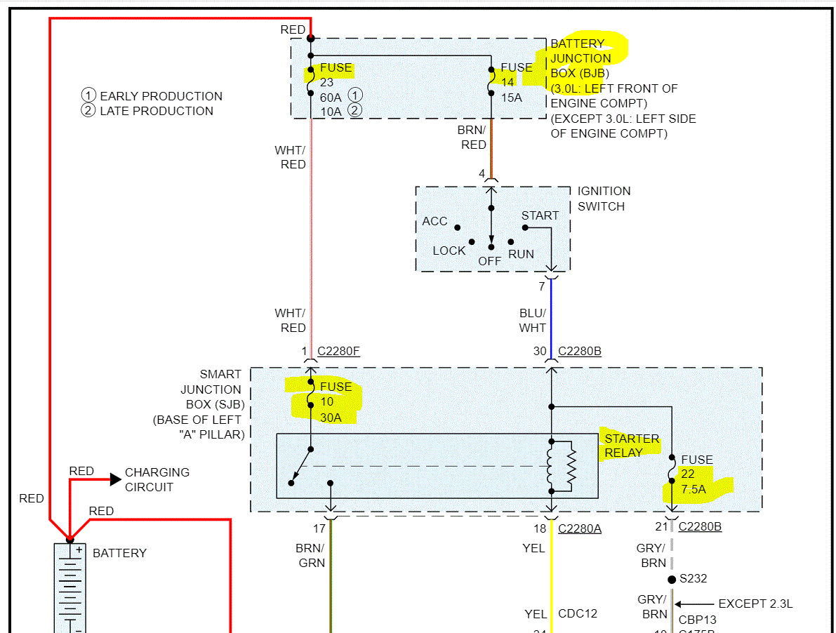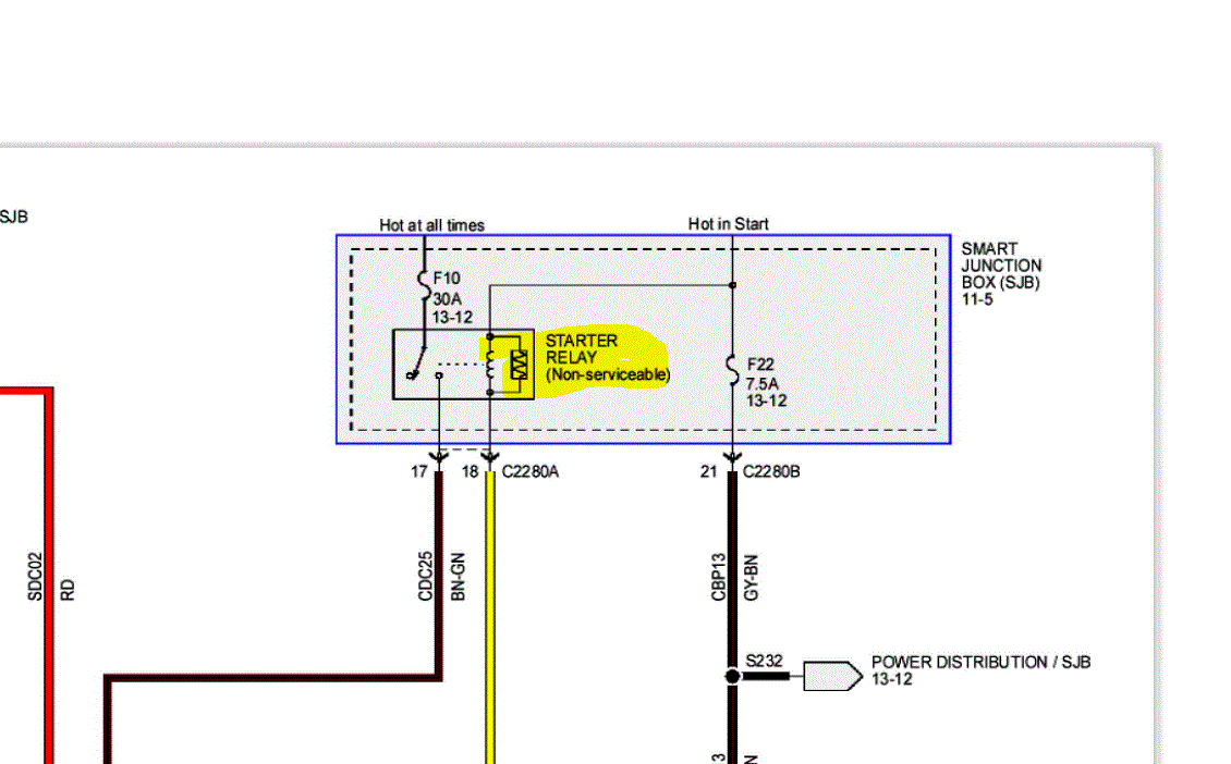 If both check good, then we need to check fuses 10 and 22 in the smart junction box (SJB) which is in the vehicle under the dash on the driver's side. The starter relay is also there, but it is integral to the SJB and is not replaceable. The entire SJB needs to be replaced if that has failed. If you look at pic 5, I highlighted the fuses to check. Pic 6 just confirms the relay issue.