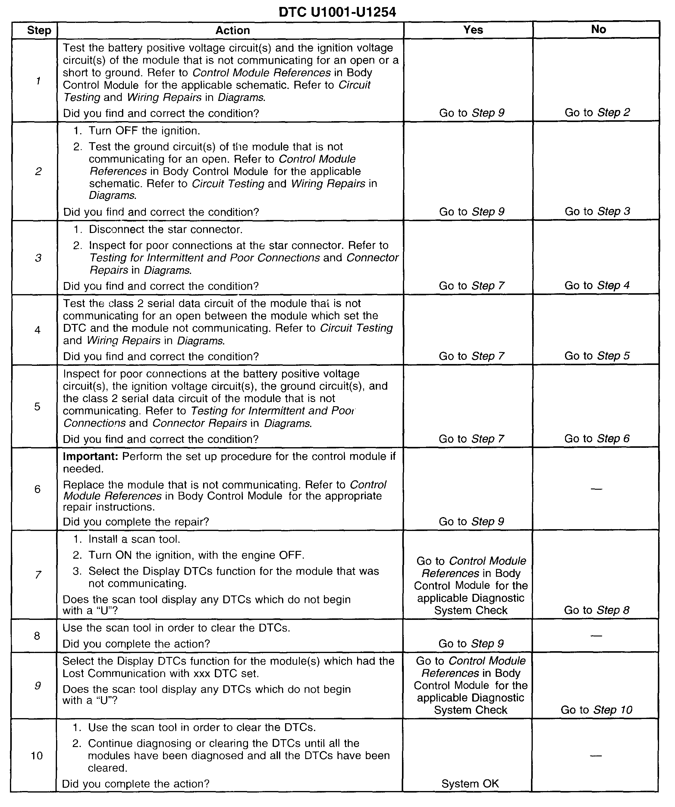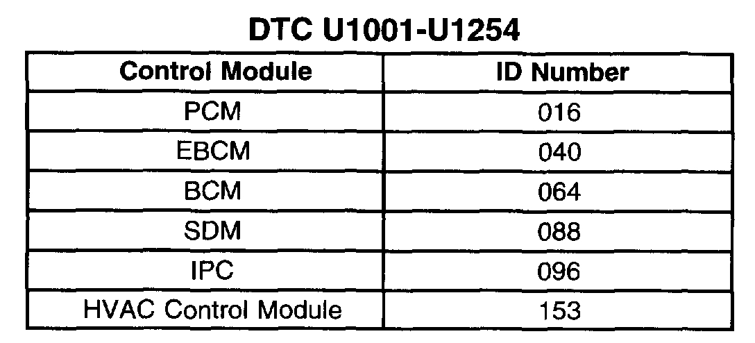 The Control Module ID Number list provides a method for determining which module is not communicating. A module with an internal class 2 serial data circuit malfunction or which loses power during the current ignition cycle would have a Lost Communication DTC set by other modules. The modules that can communicate will set a DTC indicating the module that cannot communicate. When no message is detected from a learned identification number for 5 seconds, a DTC U1xxx (where xxx is equal to the 3 digit identification number) is set.