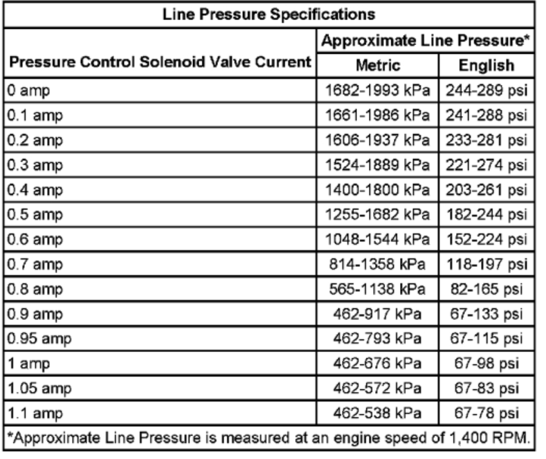 13. Refer to the Line Pressure specification table. Compare the data to the table.